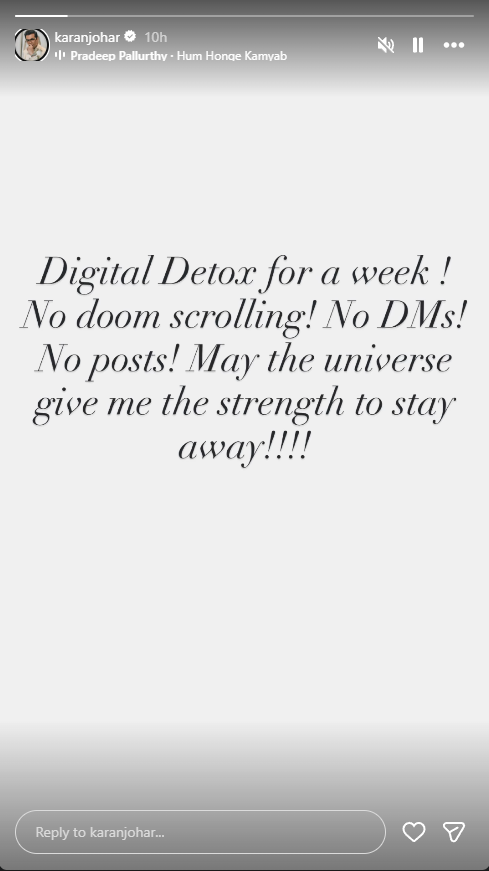 Taking to his Instagram account, Filmmaker Karan Johar announced a digital detox confirming to take a break from social media platforms for almost a week. In his story he mentioned, “Digital Detox for a week! No doom scrolling! No DMSs! No Posts! May the universe give me the strength to stay away!!!!”