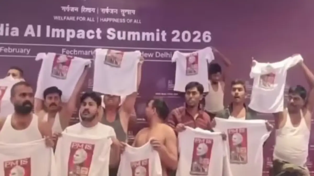 The shirts carried messages such as PM is compromised, India-US Trade Deal, and Epstein Files. On Friday, around 10 activists from the Congress’s youth wing entered the AI Summit venue and staged a dramatic shirtless protest, raising slogans against Prime Minister Modi, including PM is compromised over the India-US trade deal. Security personnel quickly intervened, and four of the protesters were later arrested for allegedly disrupting the high-profile global event.