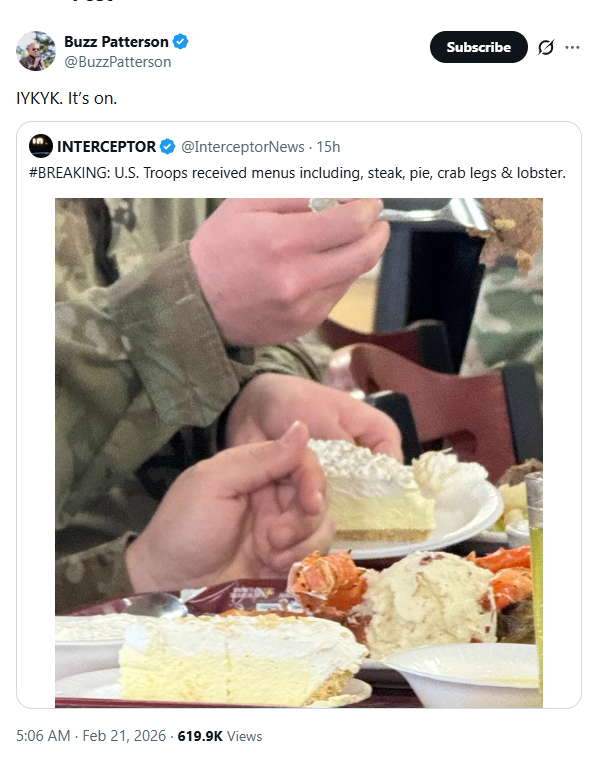 The image, shared on X, carried the caption: “US Troops received menus including steak, pie, crab legs & lobster.” The post quickly went viral, with many users interpreting the lavish spread as a possible signal of imminent military deployment. Retired US Air Force pilot Buzz Patterson added fuel to the fire by resharing the post with a pointed message: “IYKYK. It’s on.”