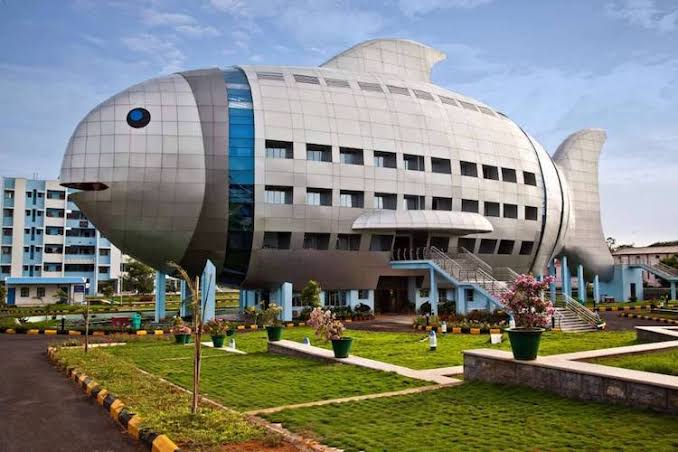 The four-storey structure, officially the headquarters of the National Fisheries Development Board (NFDB), stands out as a prime example of mimetic or novelty architecture. Shaped like a giant fish, it features a shimmering metallic exterior, sweeping fins, scale-like windows, and two large circular blue-tinted windows that mimic eyes. A slightly opened mouth serves as part of the entrance, while the entire building appears to swim in mid-air, elevated on pillars along the PV Narasimha Rao Expressway in Hyderabad, Telangana.