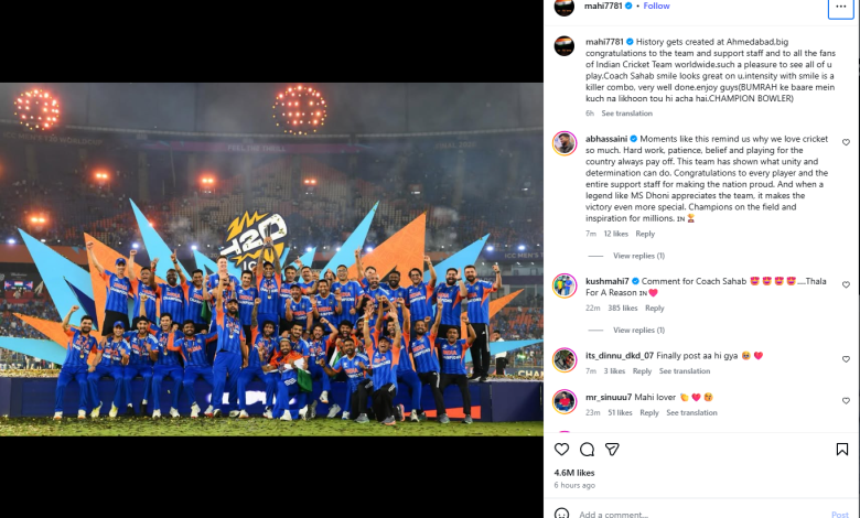 According to a report, Dhoni took to Instagram to congratulate Team India following their dominant performance in the tournament. India secured a historic win by defeating New Zealand national cricket team by 96 runs in the final at the Narendra Modi Stadium in Ahmedabad, becoming the first team to win the T20 World Cup three times.